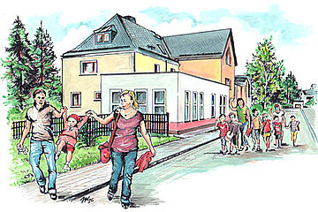 In den beiden modernen Gebäuden kümmern sich 30 Erzieherinnen um das Wohl der Kinder. Modern ausgestattete Gruppenzimmer und ein großzügiges und abwechslungsreiches Außengelände machen die Kindertagesstätte zu einem echten "Kinderparadies". Für die Kleinsten findet regelmäßig eine "Krabbelgruppe" statt. Die entsprechenden Termine erfragen Sie bitte bei der Leiterin der Einrichtung Frau Klug. Gern können Sie sich aber auch einen persönlichen Termin zur Besichtigung der Einrichtung abstimmen.